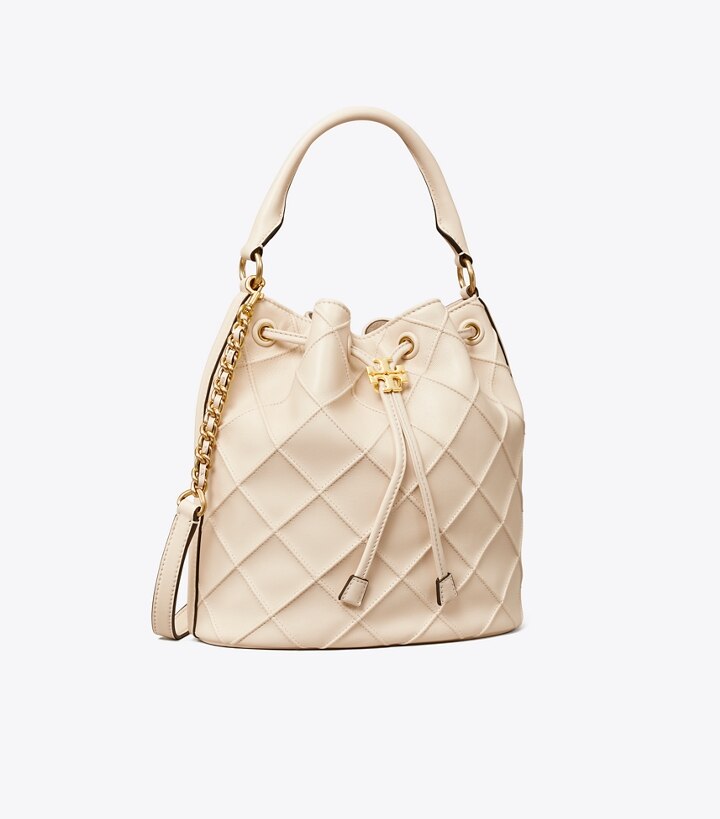 Enduring glamour. The new Fleming Bucket Bag is made of the softest leather with pintucks in a diamond pattern. Our Double T cord stopper works as a keeper for the drawstrings.
