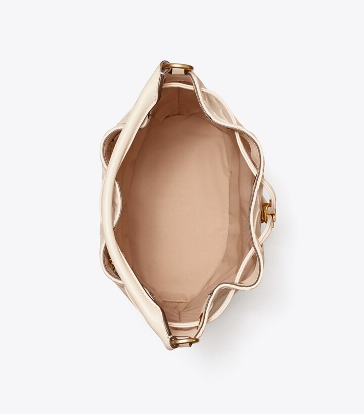Enduring glamour. The new Fleming Bucket Bag is made of the softest leather with pintucks in a diamond pattern. Our Double T cord stopper works as a keeper for the drawstrings.