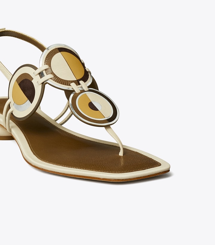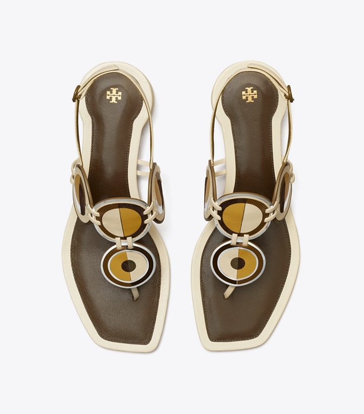 An abstract-inspired design, utilizing a meticulous assemblage of materials. Our Marquetry Disk Sandal is a geometric take on a classic thong sandal, featuring contrast colors in a mix of leather and suede. With a disk heel and cushioned leather footbed.