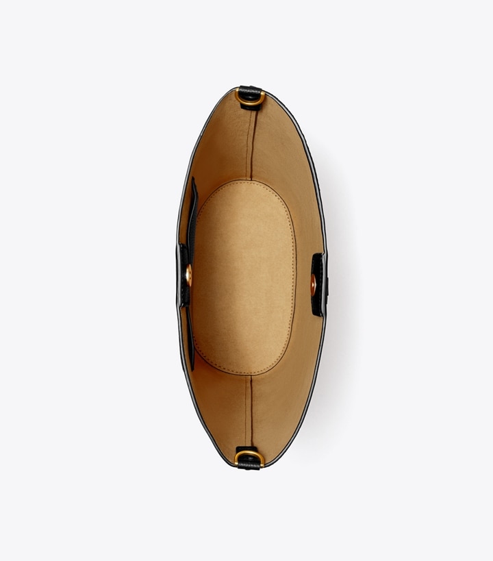 The McGraw Bucket Bag is made of soft pebbled leather, with a die-cut Double T and vertical pick stitching, sewn by hand. Interior pockets keep cards organized. Wear it two ways: by the top handle or crossbody strap.