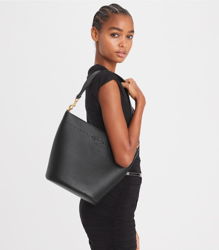 The McGraw Bucket Bag is made of soft pebbled leather, with a die-cut Double T and vertical pick stitching, sewn by hand. Interior pockets keep cards organized. Wear it two ways: by the top handle or crossbody strap.