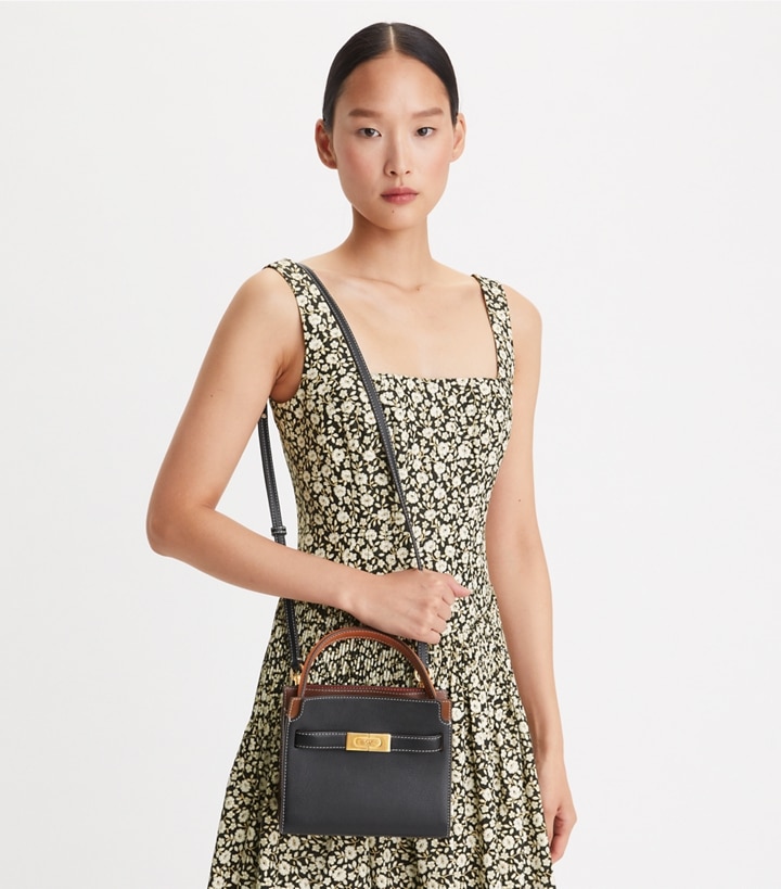 From our runway: The Petite Lee Radziwill Double Bag contrasts structure and softness, mixed materials, different colors. Composed of layers that unfold like the collar of a trench coat, it can be worn opened, semi-buttoned or fully closed. Beautifully crafted in leather and suede, with signature lock-and-key hardware and an optional crossbody strap. The collection is named for Lee Radziwill, who was fearlessly unique.?