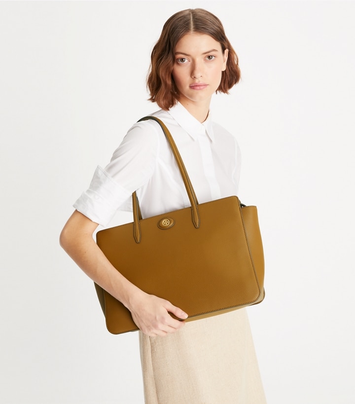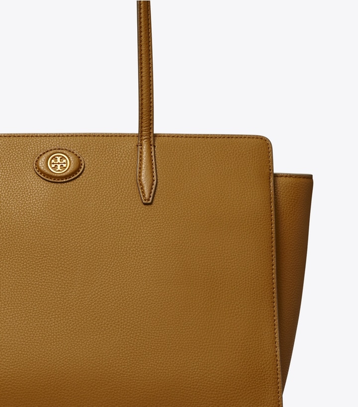A tote to take everywhere. The Robinson Tote is named after Tory's parents, Buddy and Reva Robinson. Made of rich pebbled leather, it is designed with gently curved lines and interior pockets for the essentials.