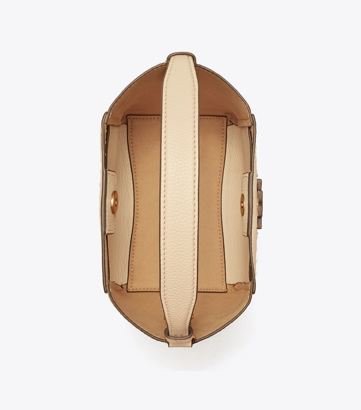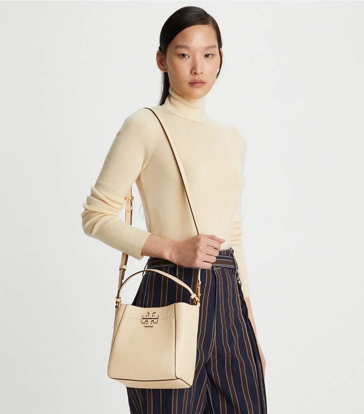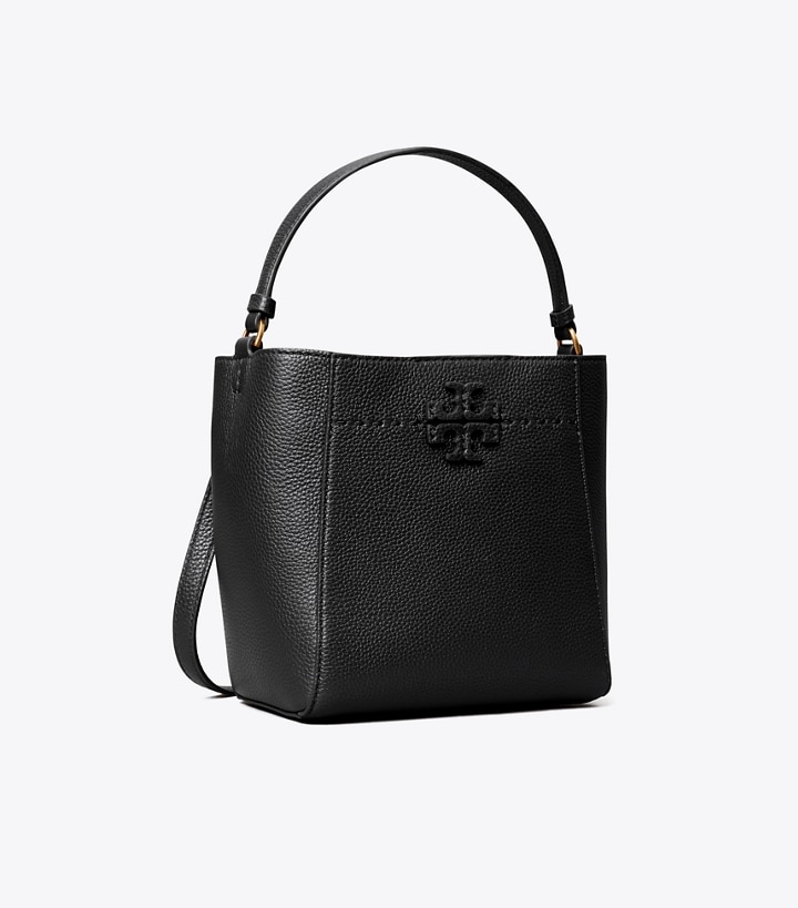The new small McGraw Bucket Bag is made of pebbled leather, with a die-cut Double T and pick stitching, sewn by hand. Carry it two ways: by the top handle or crossbody strap.