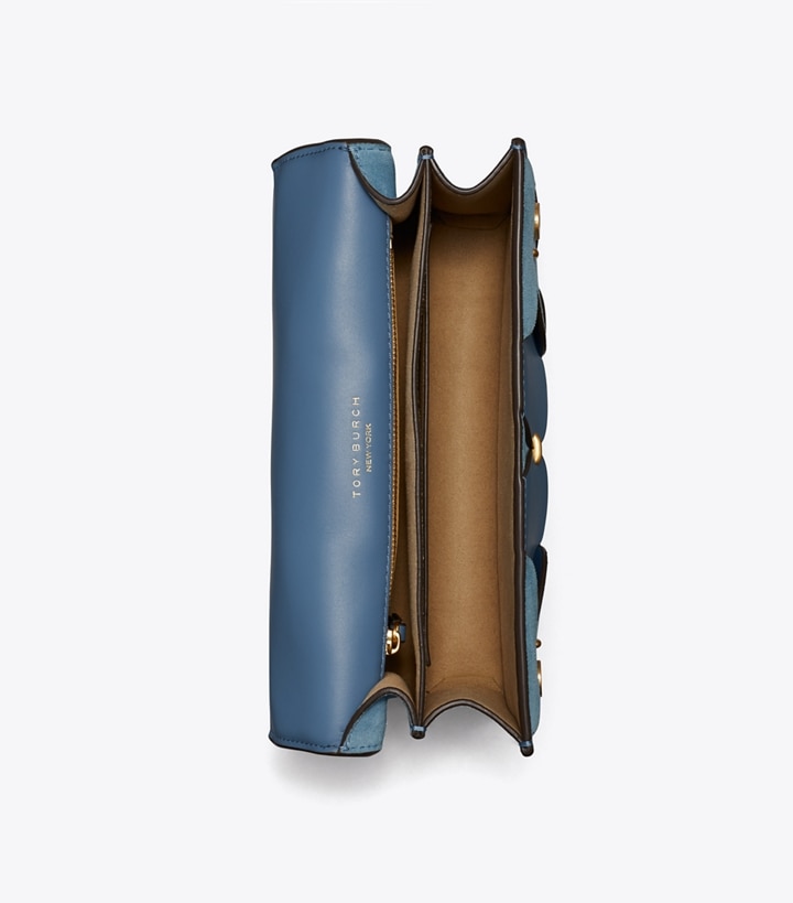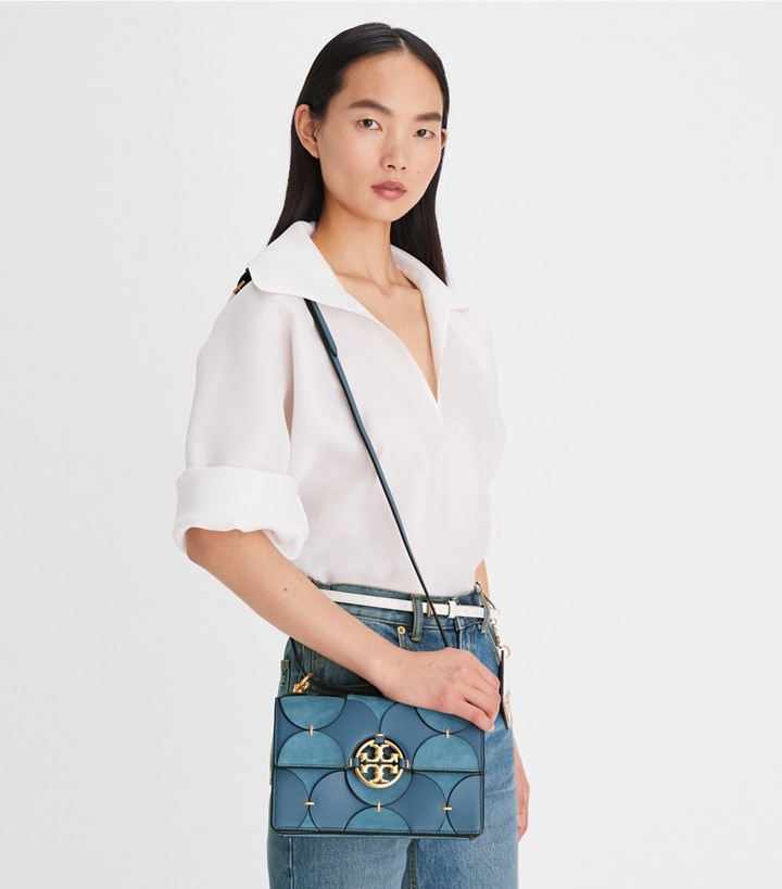 A striking expression of workmanship and artistry. Hand-woven braiding. Exquisite die-cut leather in a mix of textures. Finished with our signature Double T. The Miller Flap Shoulder Bag is designed with an adjustable crossbody strap that can be worn doubled over the shoulder. The gusseted shape opens to multiple compartments for organization.