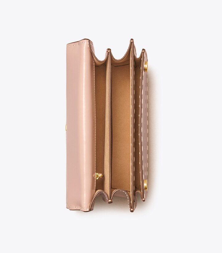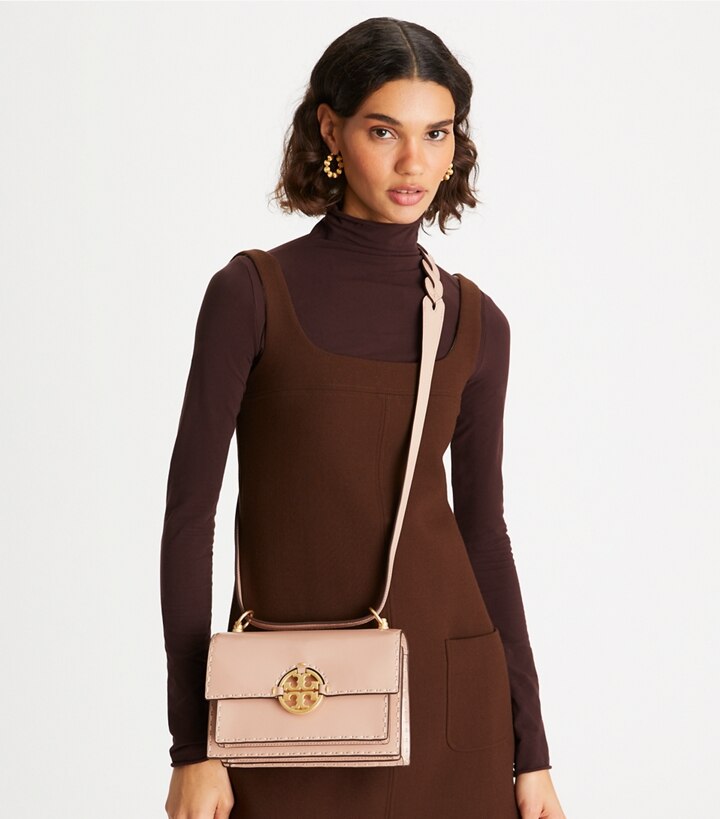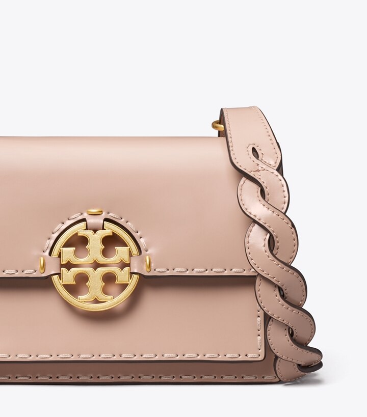 A striking expression of workmanship and artistry. Hand-woven braiding. Tonal pickstitching. Glossy spazzolato leather finished with our signature Double T. The Miller Flap Shoulder Bag is designed with an adjustable crossbody strap that can be worn doubled over the shoulder. The gusseted shape opens to multiple compartments for organization.
