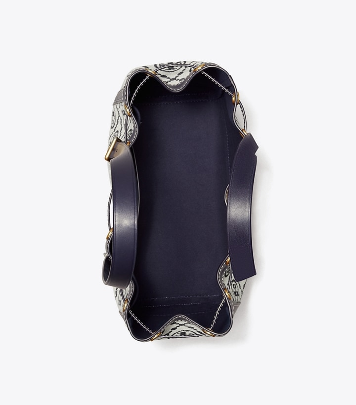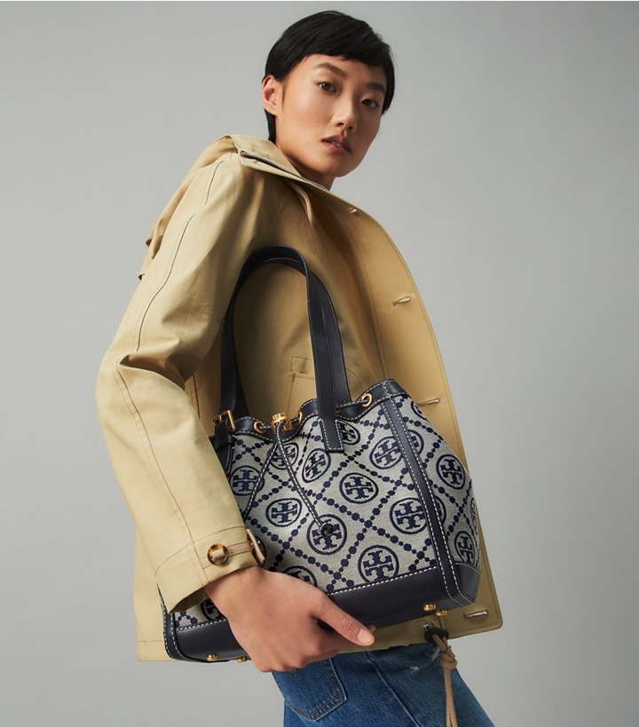 The small tote bag is trimmed in fine leather. The drawstring closure easily adjusts with a special mechanism, a brass Double T push-lock. Lined in soft microsuede, the interior has a pocket for organization. Every detail is considered, with special attention to function and versatility.