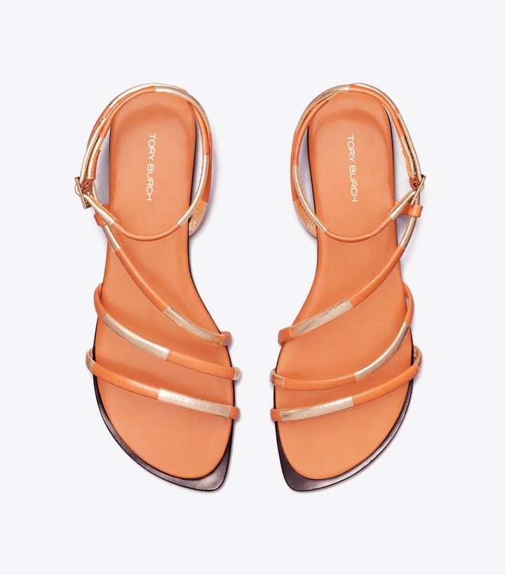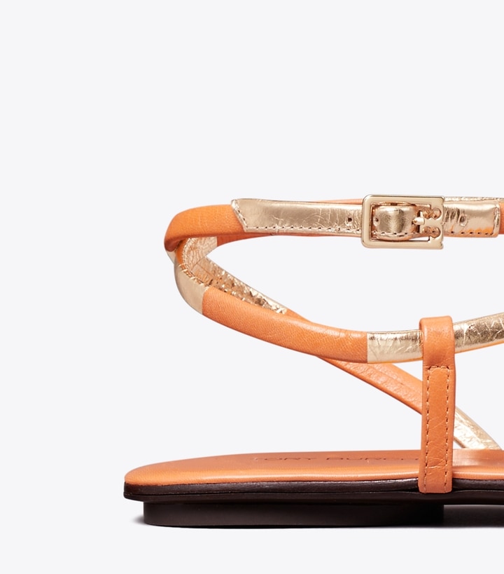 The Split Mignon Sandal features a multi-strap asymmetrical design that wraps around the foot and up the ankle. In smooth and crinkled metallic leather, it's a flattering and chic finish to any look.