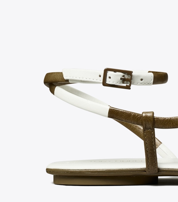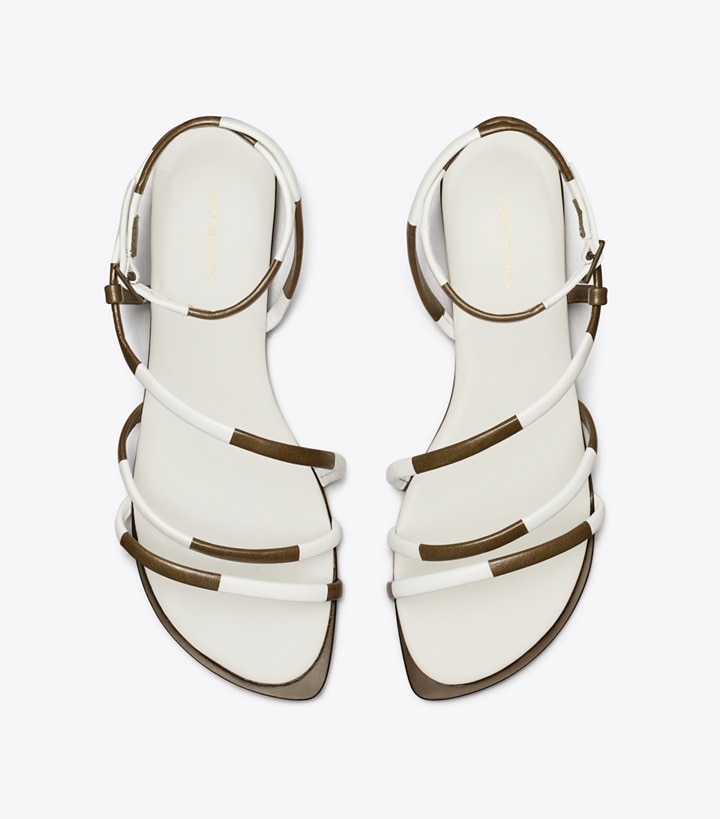 The Split Mignon Sandal features a multi-strap asymmetrical design that wraps around the foot and up the ankle. In smooth two-tone leather, it's a flattering and chic finish to any look.
