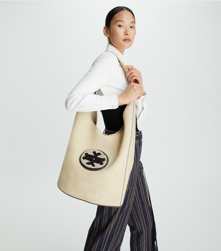 The new oversized bucket bag is crafted in soft suede with our new woven logo
