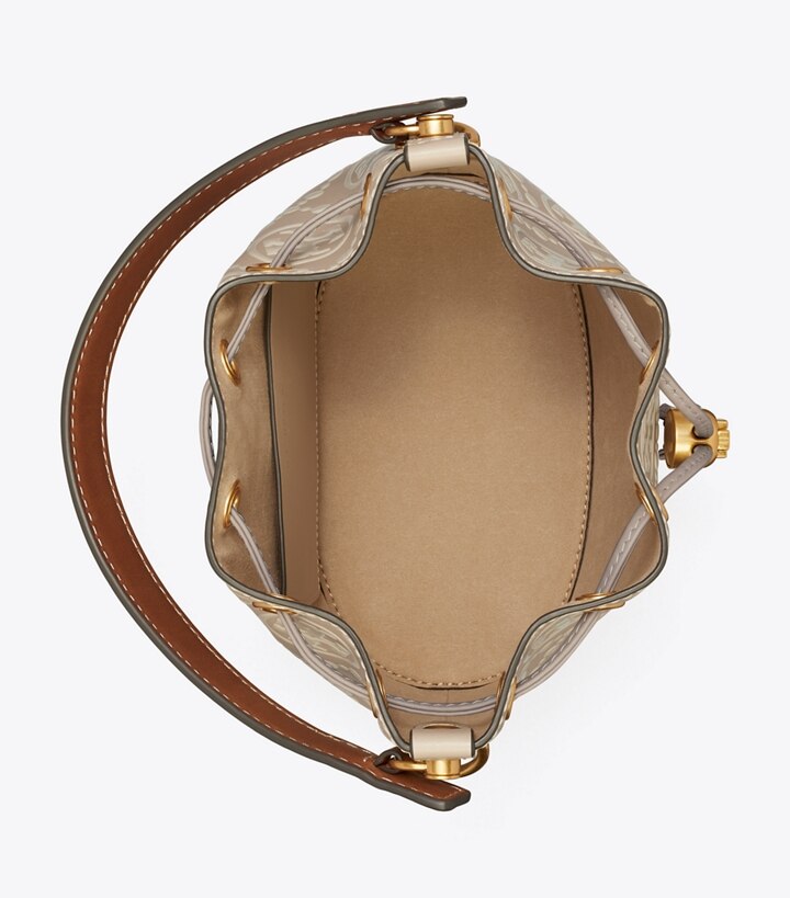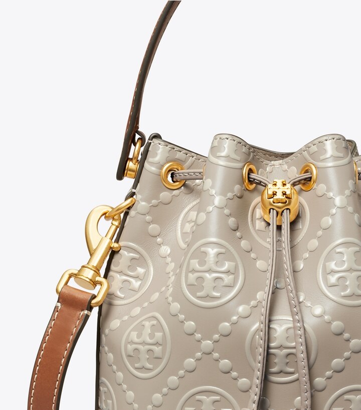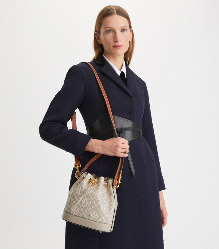 The bucket bag is crafted in contrast embossed leather. When worn crossbody, the top handle falls naturally. Our metal logo cord stopper works as a keeper for the drawstrings. Press and hold the Double T down while guiding the drawstrings through