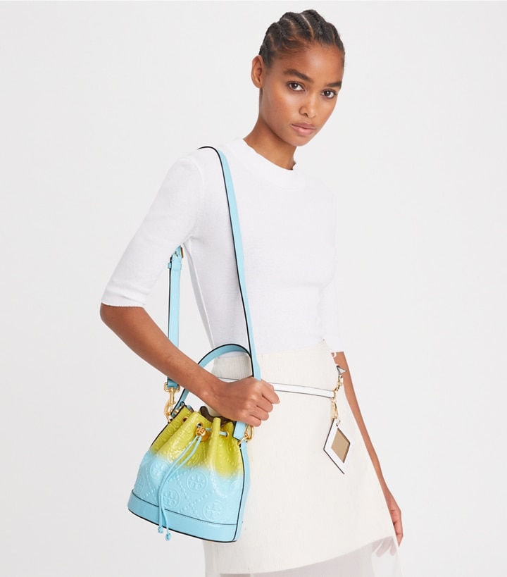 The bucket bag is crafted in embossed leather with an ombre finish. When worn crossbody, the top handle falls naturally. Our metal logo cord stopper works as a keeper for the drawstrings. Press and hold the Double T down while guiding the drawstrings through