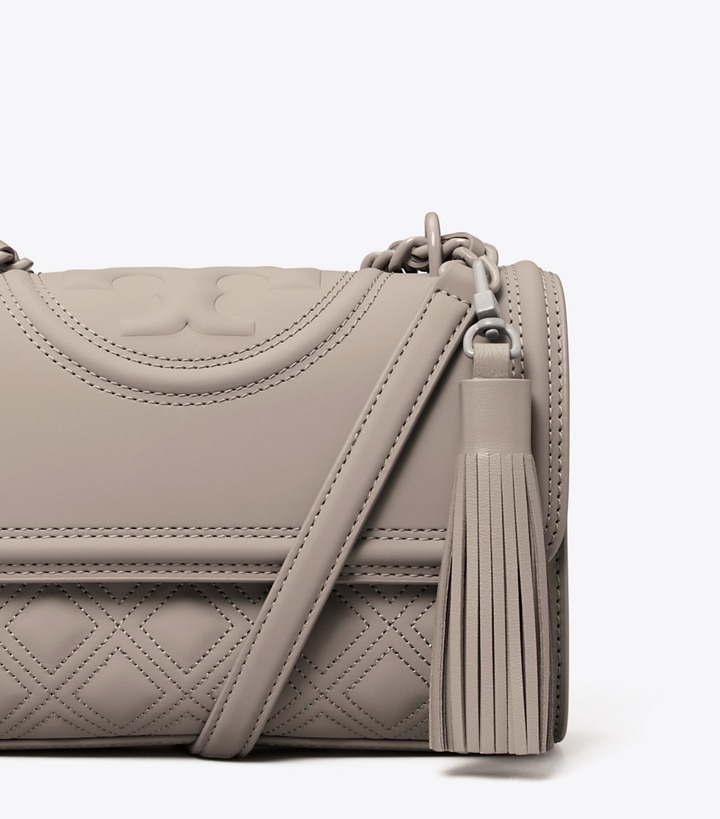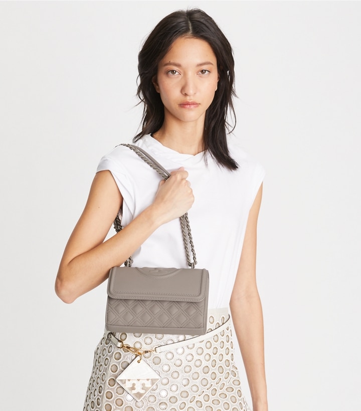 The new Fleming: a matte design with bolder diamond quilting and an embossed bombe Double T. The strap has a shoulder guard for comfort and is braided with tonal chain. It is convertible, so you can wear it short or long.