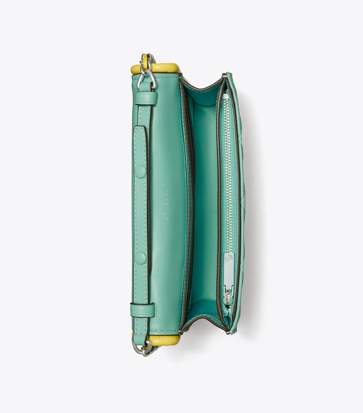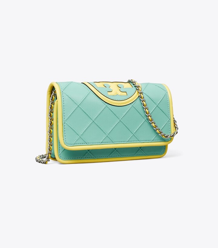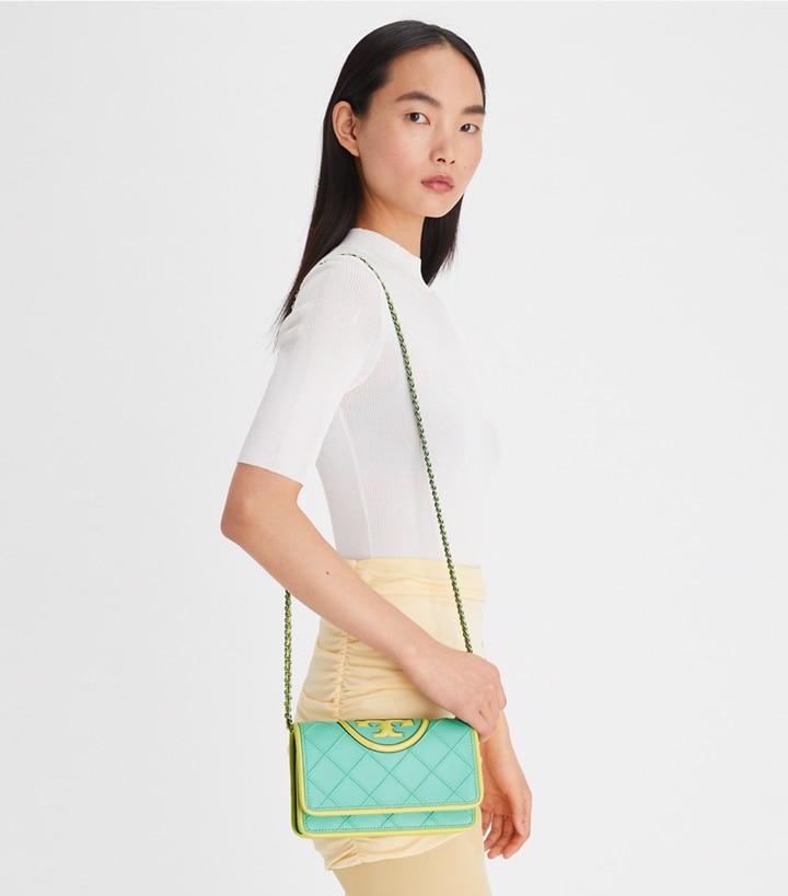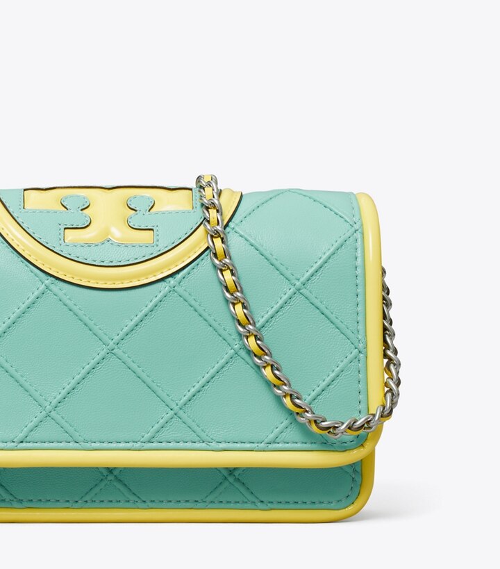 Enduring glamour. Diamond pintucks. Brushed gold chain, braided with leather. A feminine silhouette sealed with an oversized Double T. The Fleming Soft Chain Wallet is trimmed in contrast patent leather, with pockets for cards, a phone and full-length bills.
