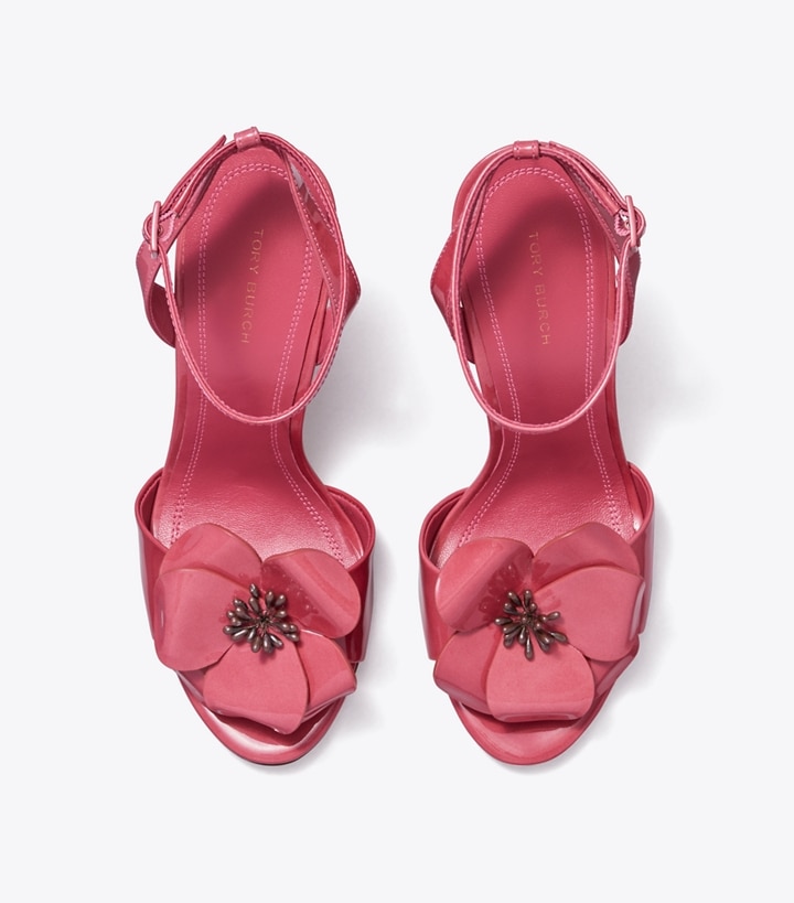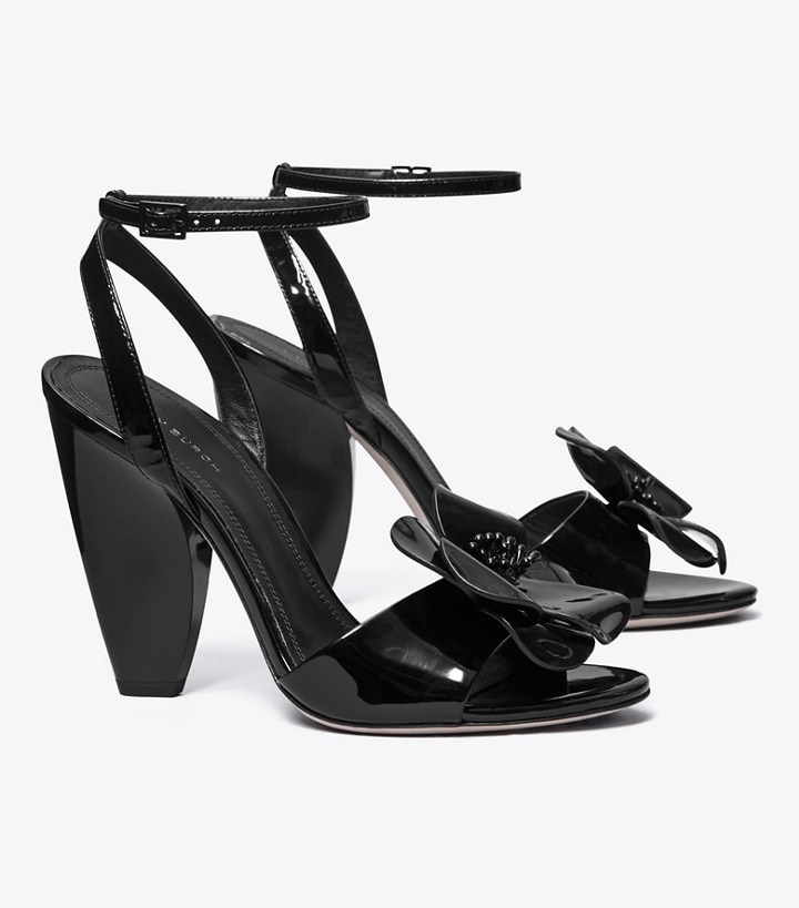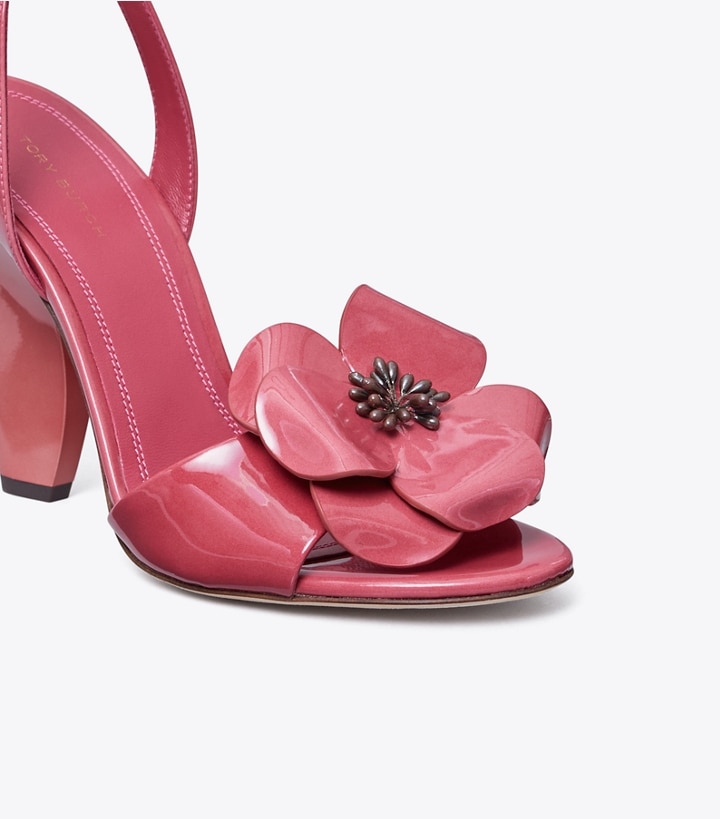 Feminine and sculptural, this curved-heel sandal is designed with napa leather petals, hand-molded to form a dimensional pansy that's centered with resin and crystal pistils. Derived from the French word "pensee," meaning "thought," pansies have symbolized love and free-thinking throughout history, from ancient Greece to Victorian England. A cushioned footbed ensures comfort.