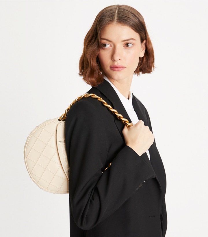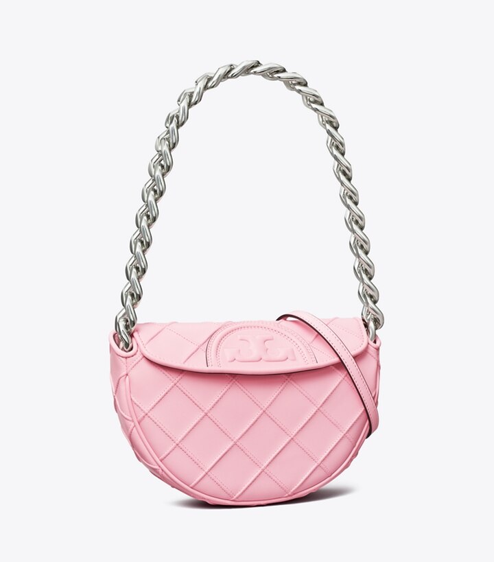 Enduring glamour. Pintucks in a diamond pattern and the softest leather. Sealed with an oversized Double T. The Mini Fleming Crescent Bag has a chunky chain strap and a secure snap closure that opens to multiple card pockets for organization. Wear it tucked under the arm or crossbody with the removable strap.