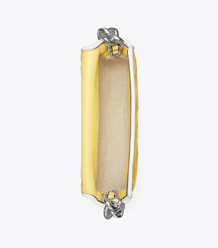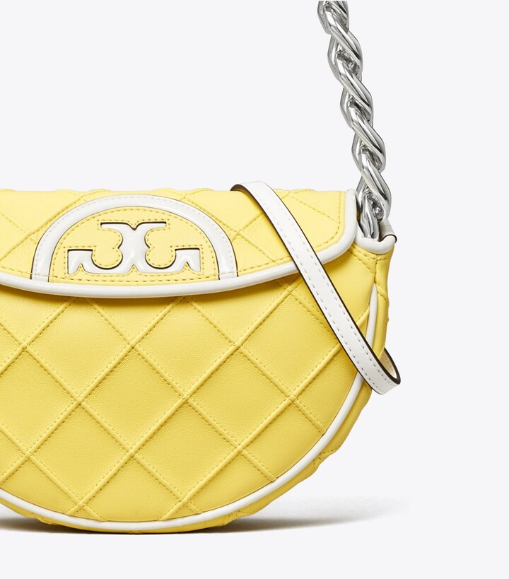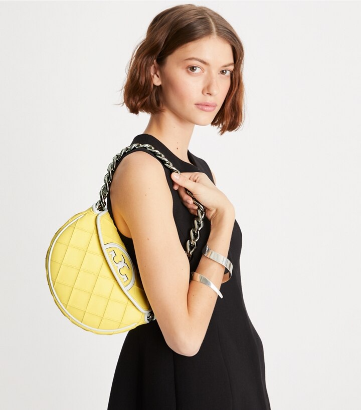 Enduring glamour. Pintucks in a diamond pattern and the softest leather, trimmed in patent. Sealed with an oversized Double T. The Mini Fleming Crescent Bag has a chunky chain strap and a secure snap closure that opens to multiple card pockets for organization. Wear it tucked under the arm or crossbody with the removable strap.