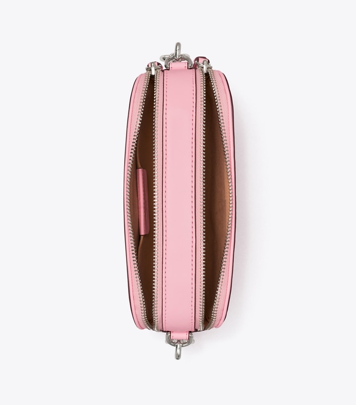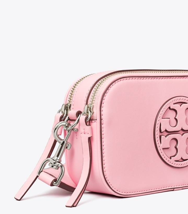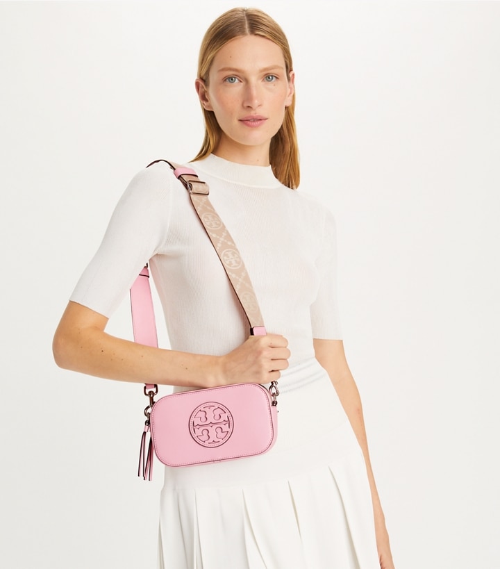 From our signature collection. The Mini Miller Crossbody Bag is crafted in soft pebbled leather with two zippered compartments and a laser-cut Double T. Wear it with or without the removable jacquard strap.