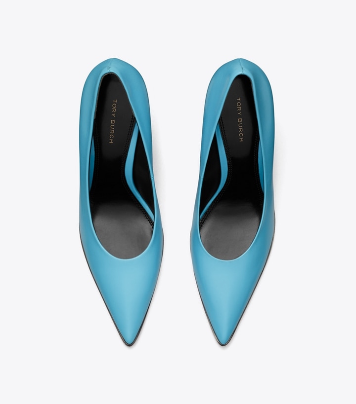 A geometric take on a classic pump. Sculptural and experimental, the new shoe is designed with a triangular heel and sharp, pointed toe. The cushioned footbed ensures comfort, whether you are wearing it to work or a party.