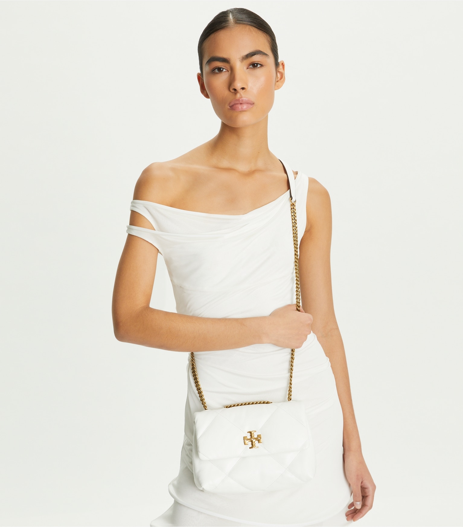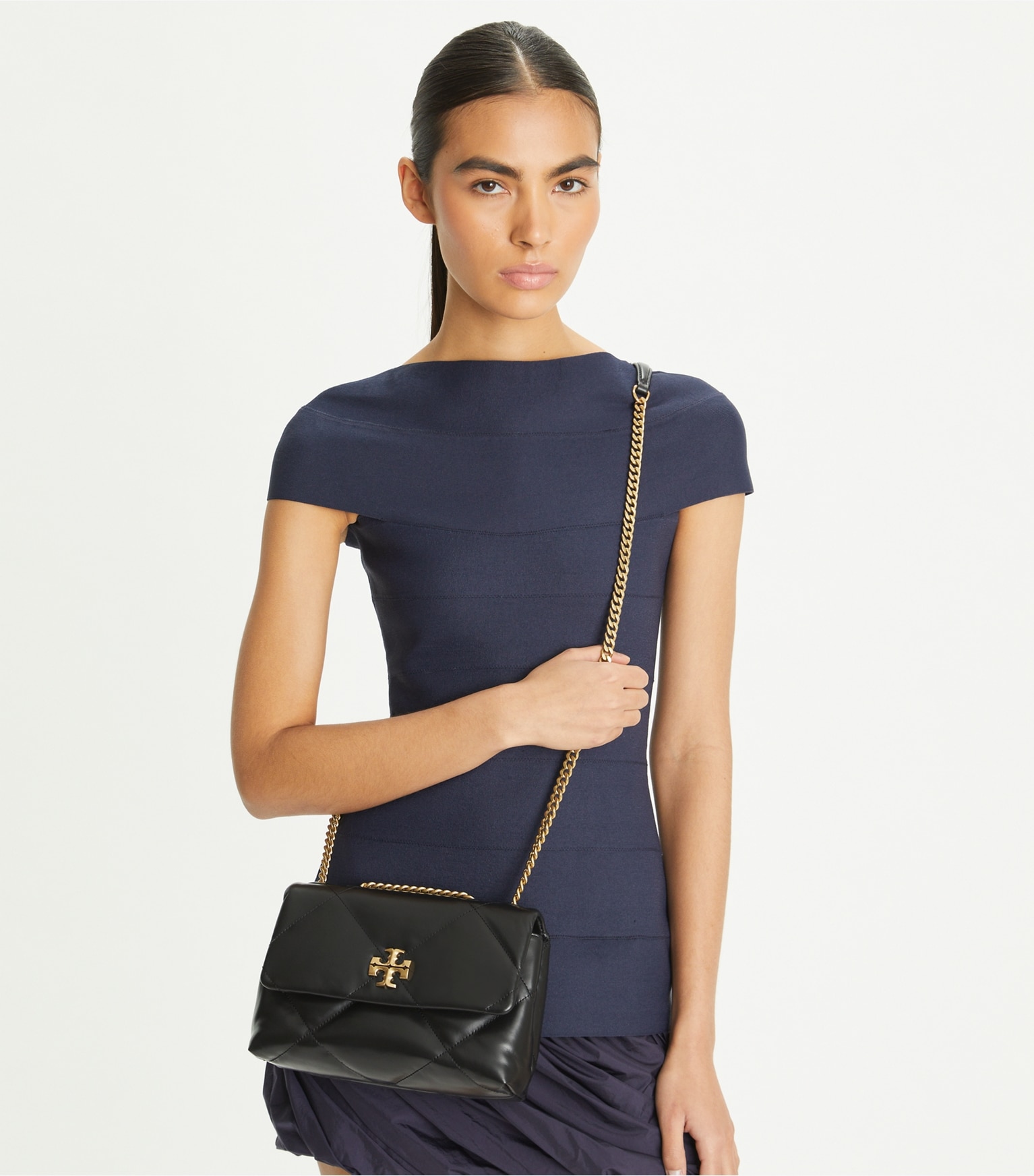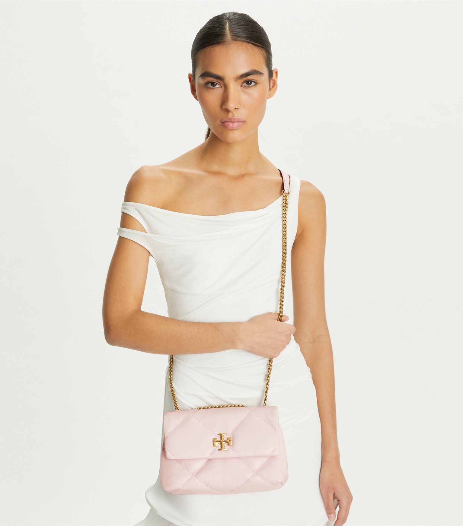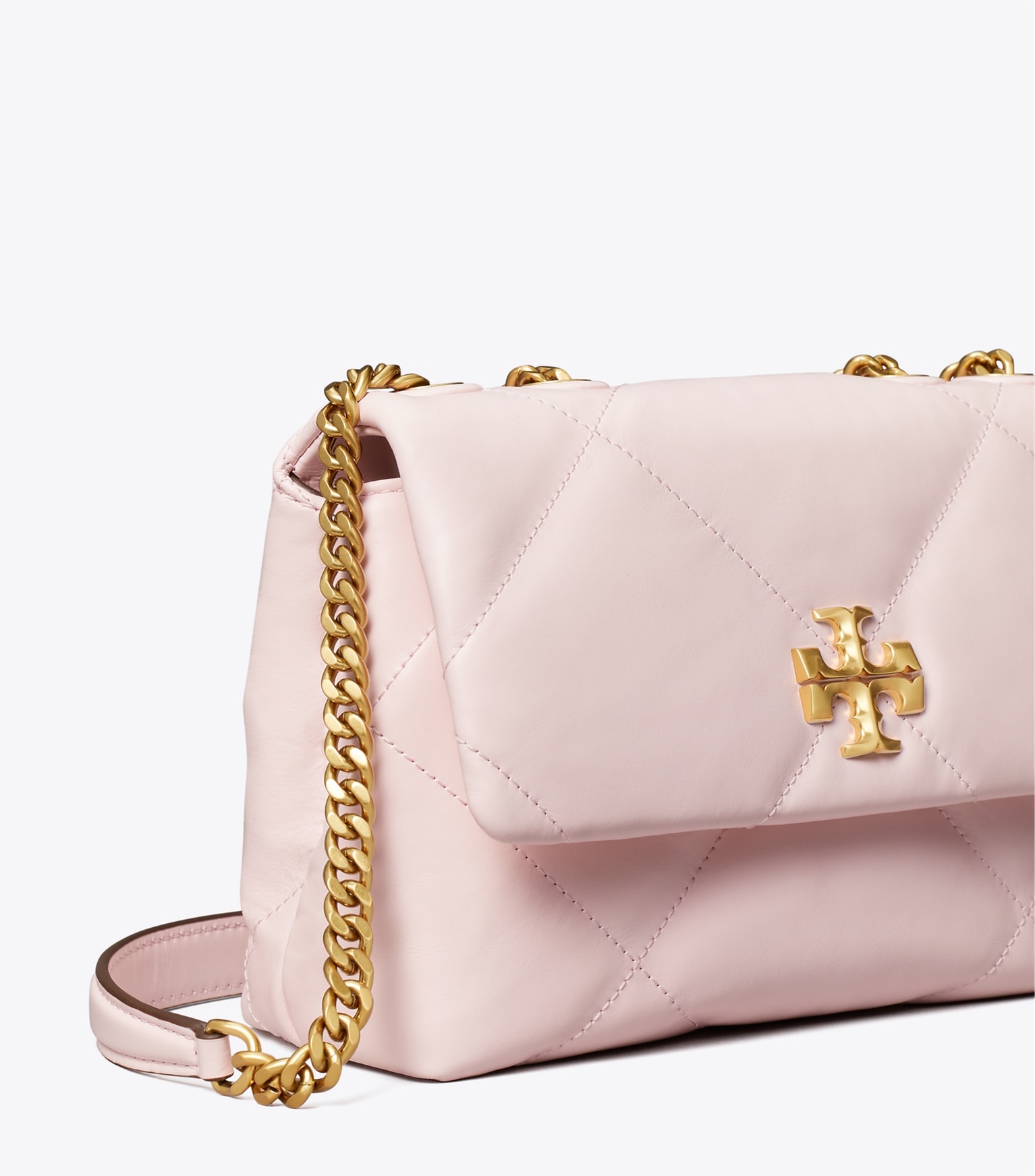 Introducing the Spring ’24 Small Kira Diamond Quilt Convertible Shoulder Bag. Irresistibly soft with blown-up diamond quilting. Pillowy dimension on a classic shape, punctuated by beveled Double T hardware. Wear the curb chain strap doubled over the shoulder or long and crossbody.