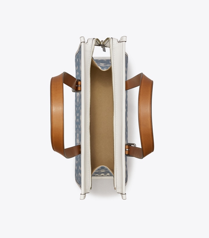 The small tote bag is trimmed in fine leather, with a zip-top closure and a removable crossbody strap. Lined in soft microsuede, the interior has pockets for organization. Every detail is considered, with special attention to function and versatility.