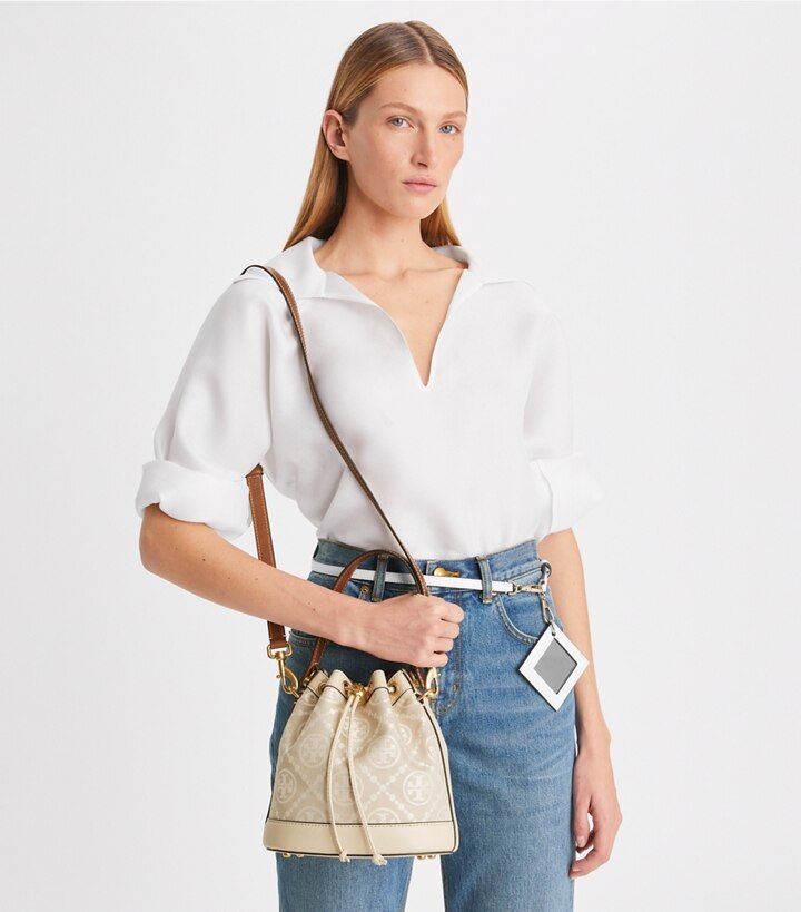 The bucket bag is crafted in leather-trimmed jacquard. When worn crossbody, the top handle falls naturally. Our metal logo cord stopper works as a keeper for the drawstrings. Press and hold the Double T down while guiding the drawstrings through