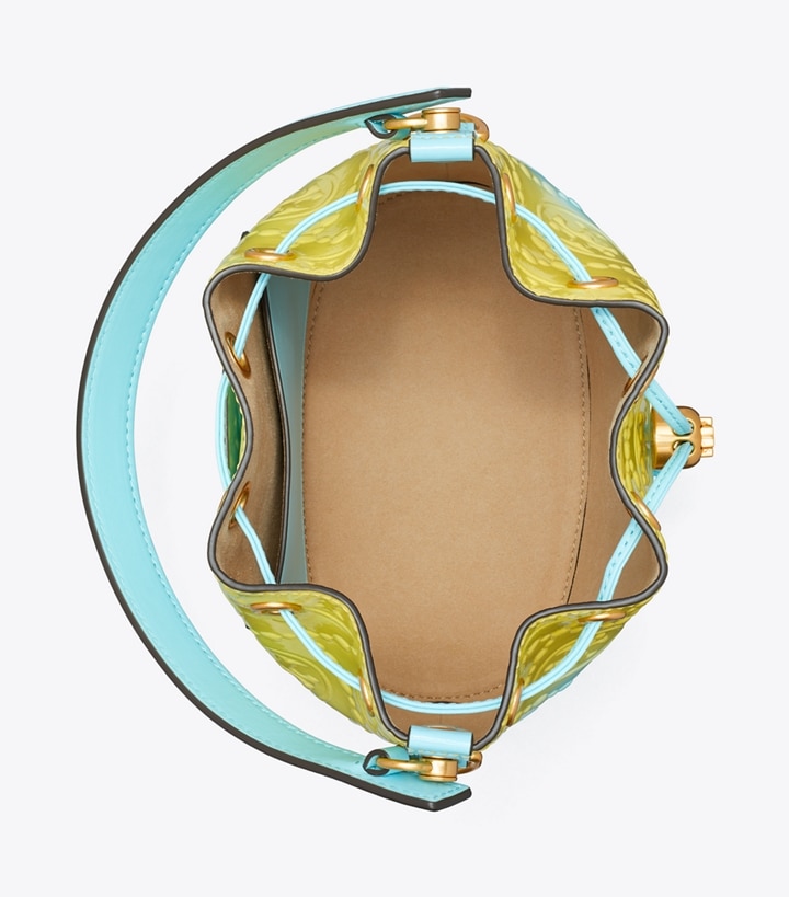 The bucket bag is crafted in embossed leather with an ombre finish. When worn crossbody, the top handle falls naturally. Our metal logo cord stopper works as a keeper for the drawstrings. Press and hold the Double T down while guiding the drawstrings through
