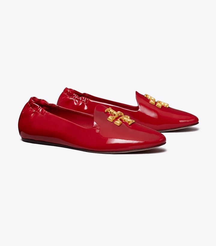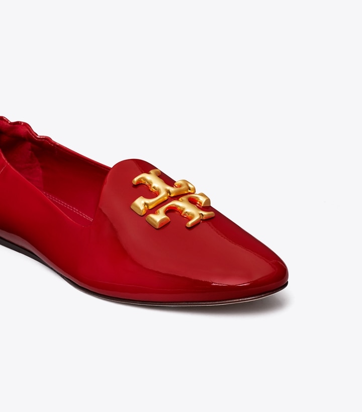 Signature hardware, scaled-up and sculptural. Based on a traditional Venetian slipper, the Eleanor Loafer is made of soft patent leather with a ruched back. A cushioned footbed with a small interior wedge adds comfort and slight lift.