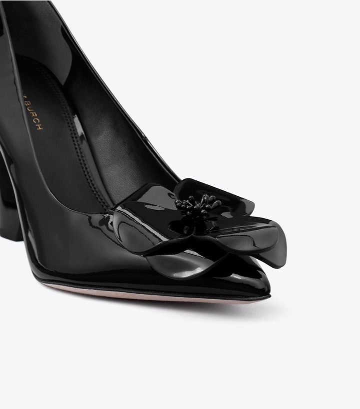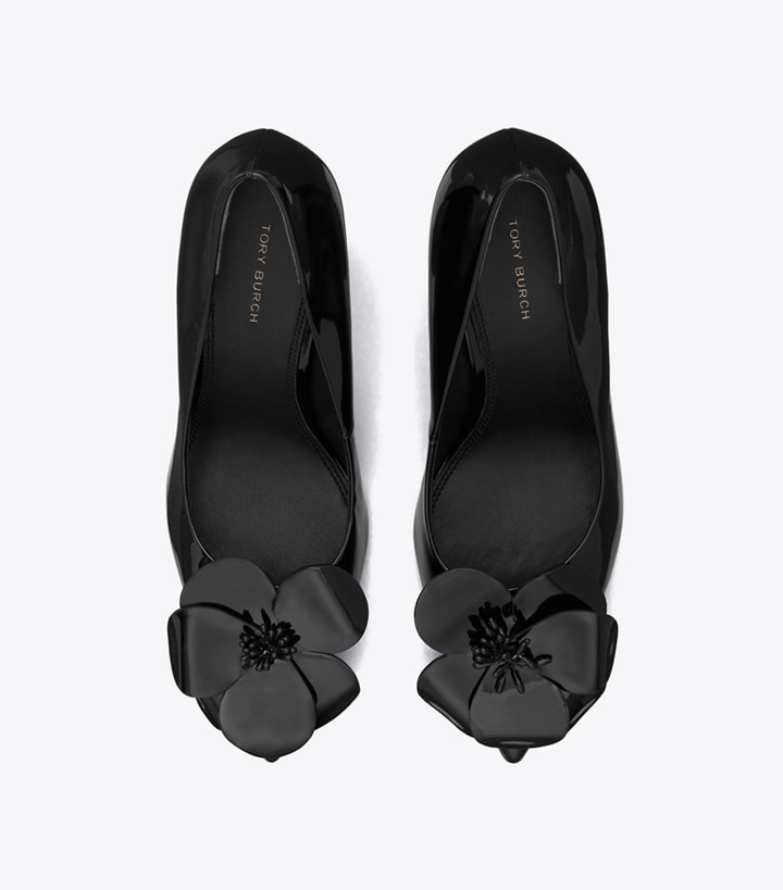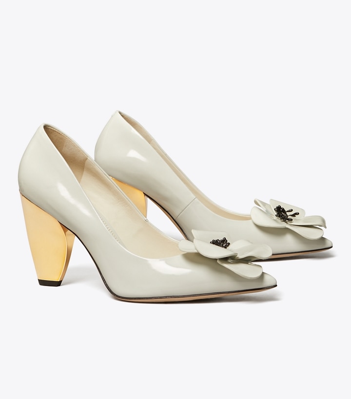 Feminine and sculptural, this curved-heel pump is designed with napa leather petals, hand-molded to form a dimensional pansy that's centered with resin and crystal pistils. Derived from the French word "pensee," meaning "thought," pansies have symbolized love and free-thinking throughout history, from ancient Greece to Victorian England. A cushioned footbed ensures comfort.