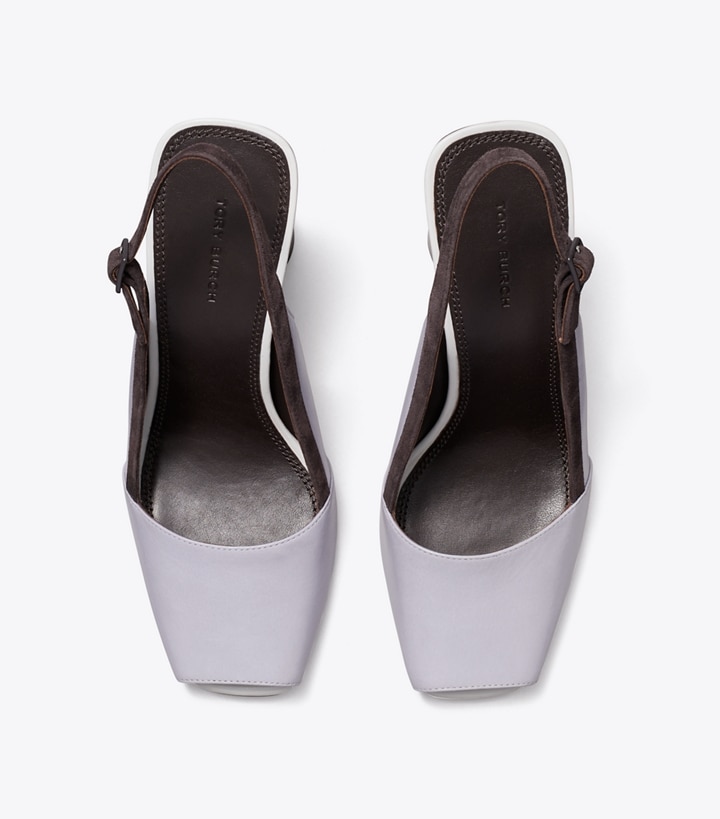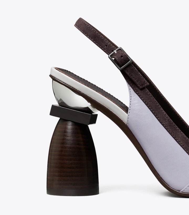 An abstract-inspired design, utilizing a meticulous assemblage of leather. Our Marquetry Block Heel is a modern peep-toe with a stacked and sculptural heel. Made with leather, suede and metal.